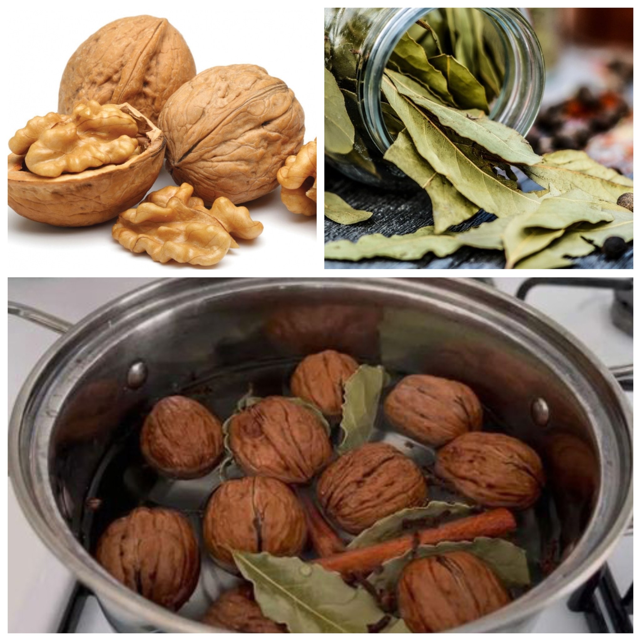 Toss walnuts and bay leaves into the pot, and observe the outcome after boiling for 5 minutes