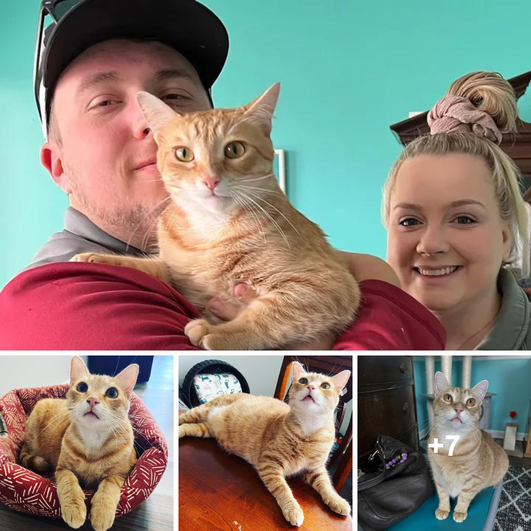 A cat curled up between a couple after he had waited 848 days for a home since he was just a kitten. Beckham the catSparkleCat RescueAn orange...
