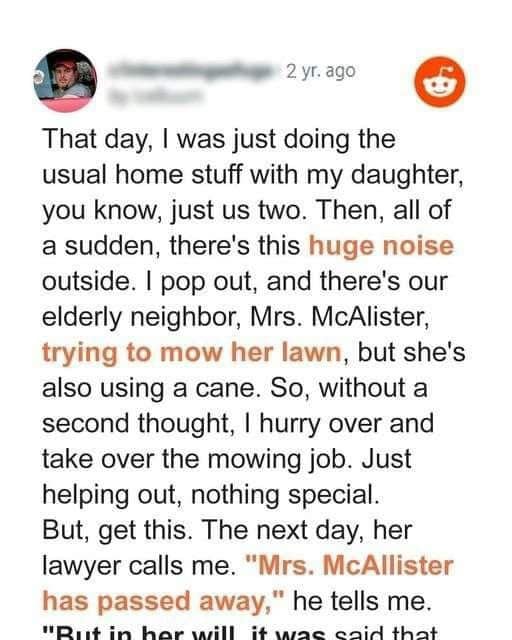 Felix, a handyman and single dad, witnesses his elderly neighbor, Mrs. McAllister, struggling with her overgrown lawn. Despite her resistance, he helps her out and is surprised when...