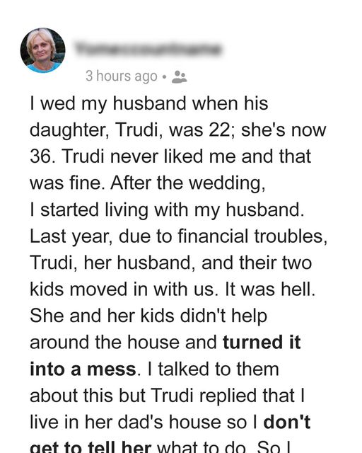 A woman, married to a man with a 36-year-old daughter named Trudi, faced challenges when Trudi and her family moved in due to financial issues. Despite an agreement...