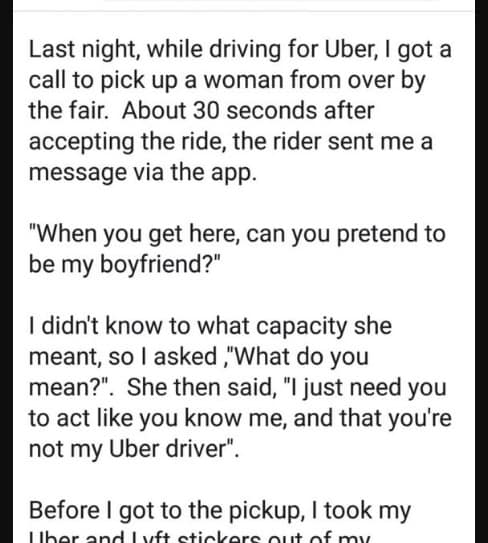 Last night, while driving for Uber, I got a call to pick up a woman from over by the fair. About 30 seconds after accepting the ride, the...