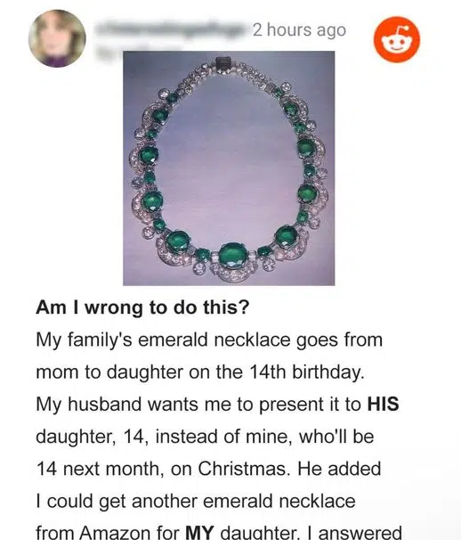 A woman faced a dilemma with a family heirloom, an emerald necklace traditionally passed down to the eldest child. Her husband wanted it for his daughter from a...