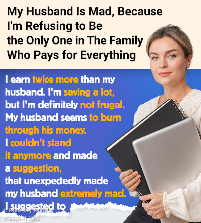 She can’t believe how he reacted to a seemingly innocent suggestion of hers regarding their family budget. The woman regrets even raising this topic with her spouse, because...