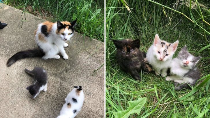 A Stray Cat Approaches Rescuers And Leads Them To Her Three Helpless Kittens